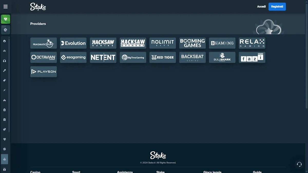 Stake si distingue grazie alla collaborazione con 17 rinomati software provider, tra cui giganti del settore come Relax Gaming, Pragmatic Play, Evolution Gaming e Hacksaw Gaming.