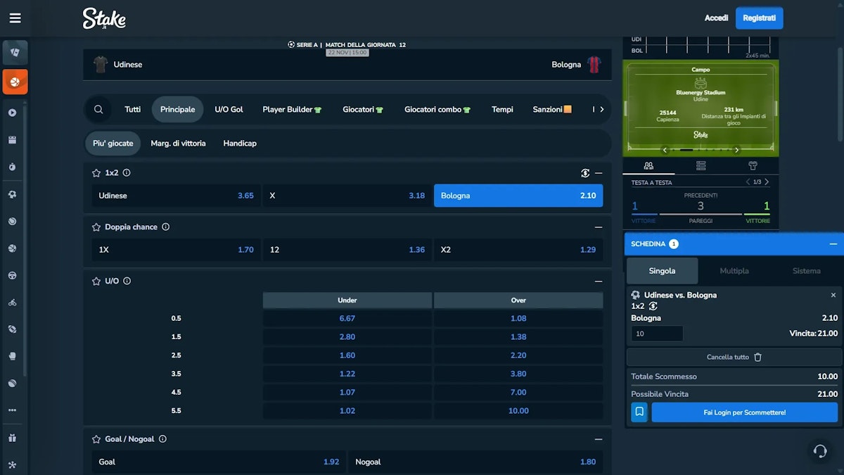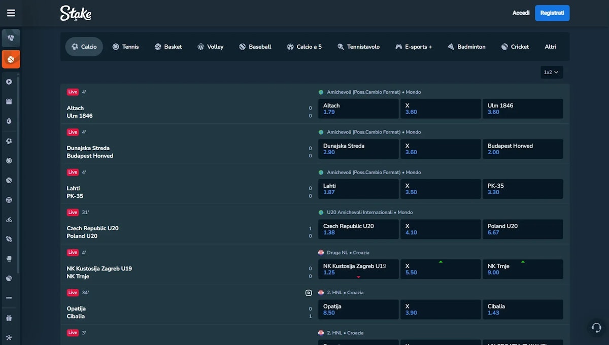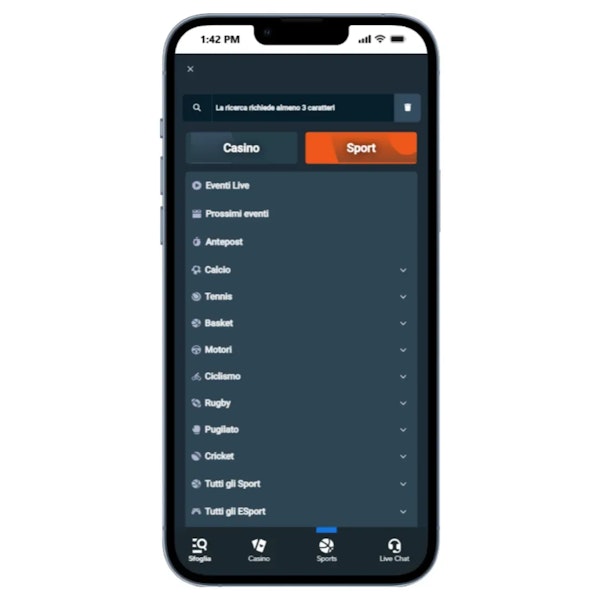 Nella sezione sport, abbiamo notato che il menù laterale richiederebbe un'interfaccia più intuitiva, ma nonostante ciò la varietà di sport disponibili e la possibilità di assistere a numerosi match in streaming, rappresentano punti di forza significativi, migliorando l'esperienza delle scommesse live.