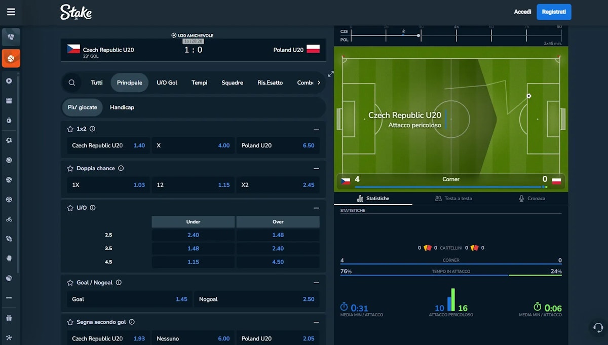 Abbiamo trovato particolarmente attrattiva l'opzione di streaming dei match, che arricchisce l'esperienza di scommessa permettendo di seguire in diretta un gran numero di eventi. Durante la Coppa d'Asia, ad esempio, abbiamo potuto scommettere in live, godendoci la partita in streaming direttamente sulla piattaforma, senza alcun blocco o rallentamento.